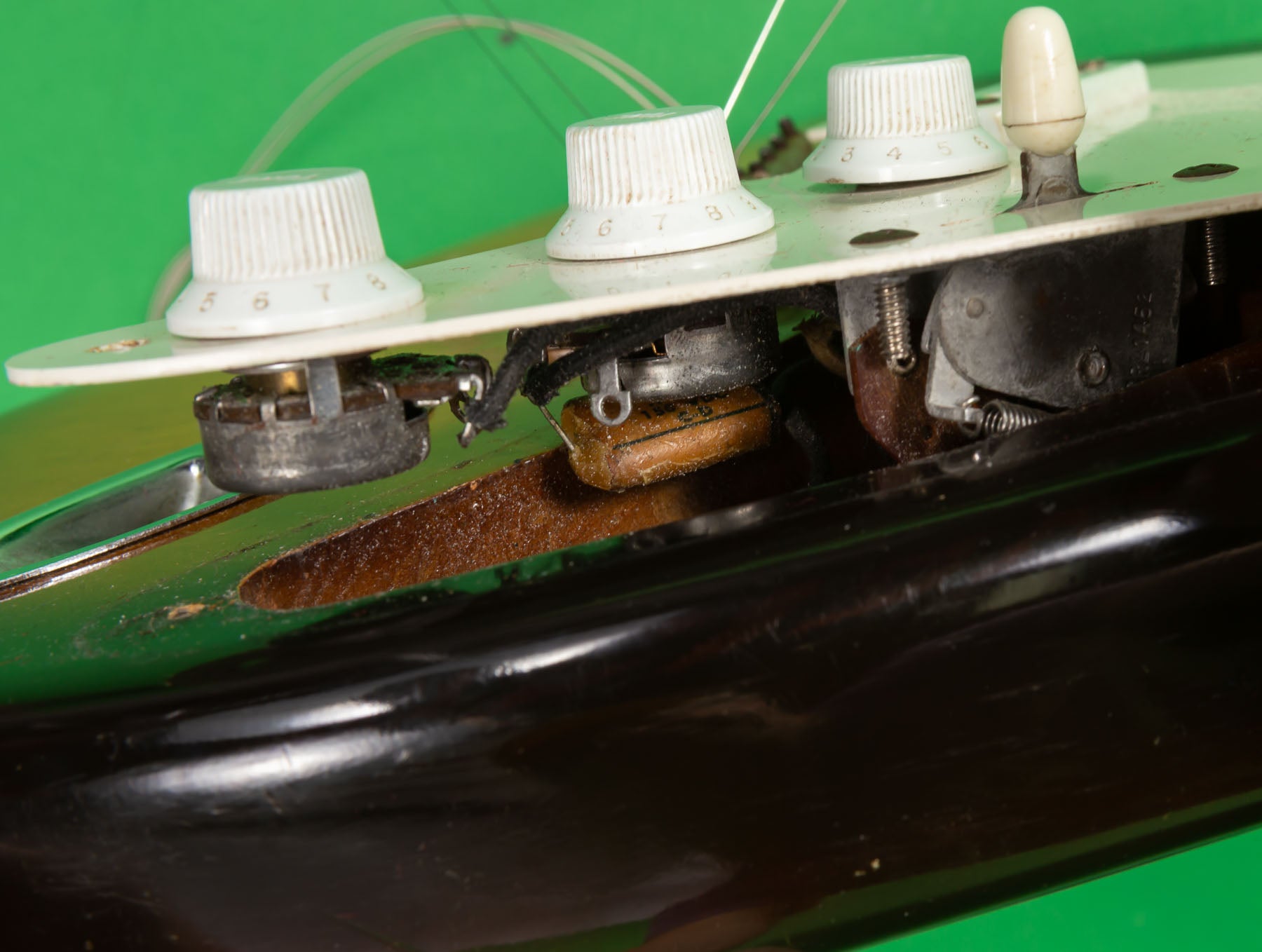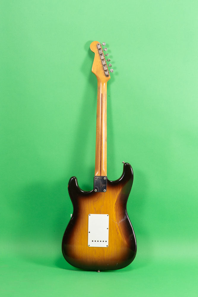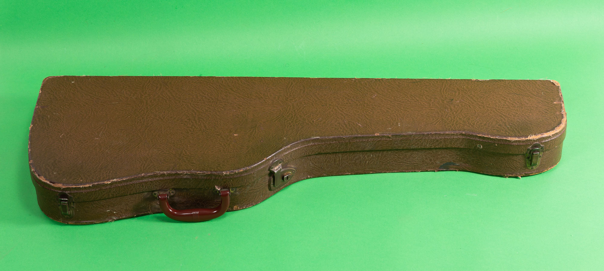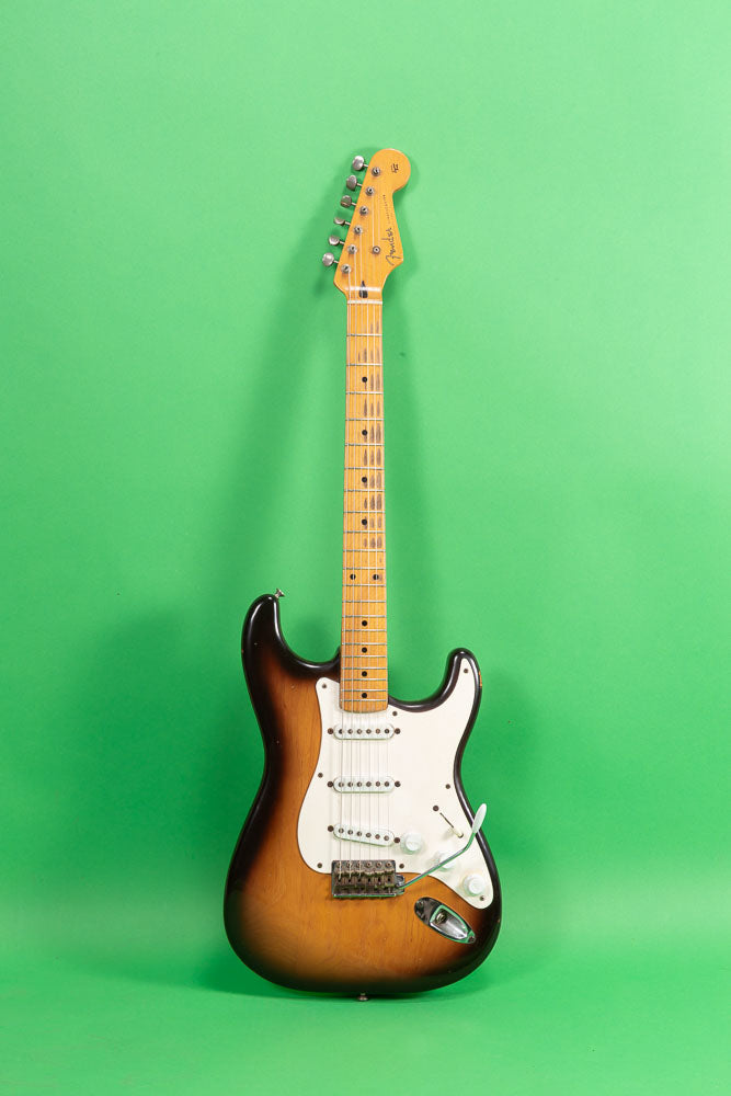 The Fender Stratocaster is the most copied, best selling electric guitar design ever. This is one of the first and finest examples ever made, from June 1954, the beginning of something very important. This guitar has many of the very early features that are unique to guitars from this time frame. The headstock end of the truss rod is painted black. That is only found on some guitars from June 1954. The pickup cavities are flat on the bottom, pre dating the channel for the wires that came a moment later. The guitar has the early form fit case seen only in the first part of 1954. The serial number is low and found on the neck plate and also in pencil on the underside of the pick guard. The tape in the control cavity reads 6-16-54 Mary, the completion date. The knobs and switch tip are replaced.T he guitar weighs 8 pounds two ounces. It is still in nice original condition.