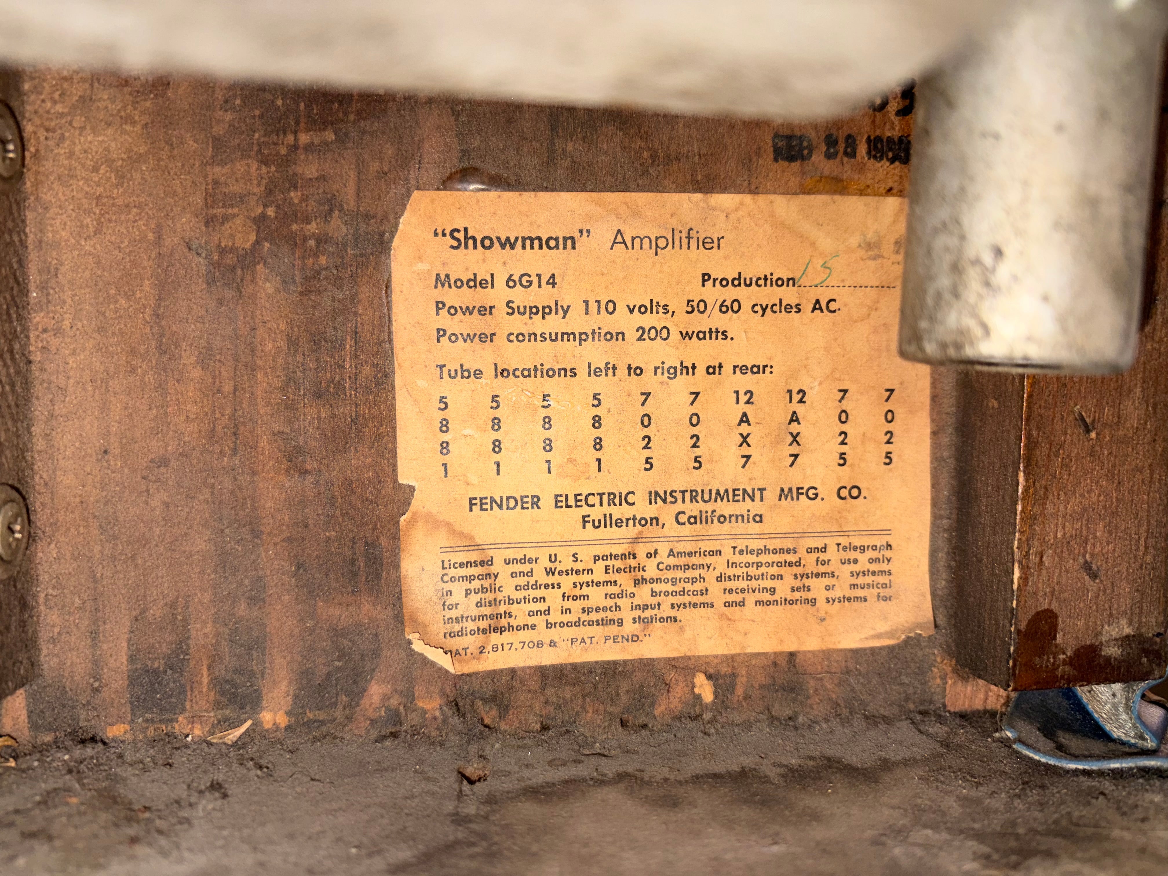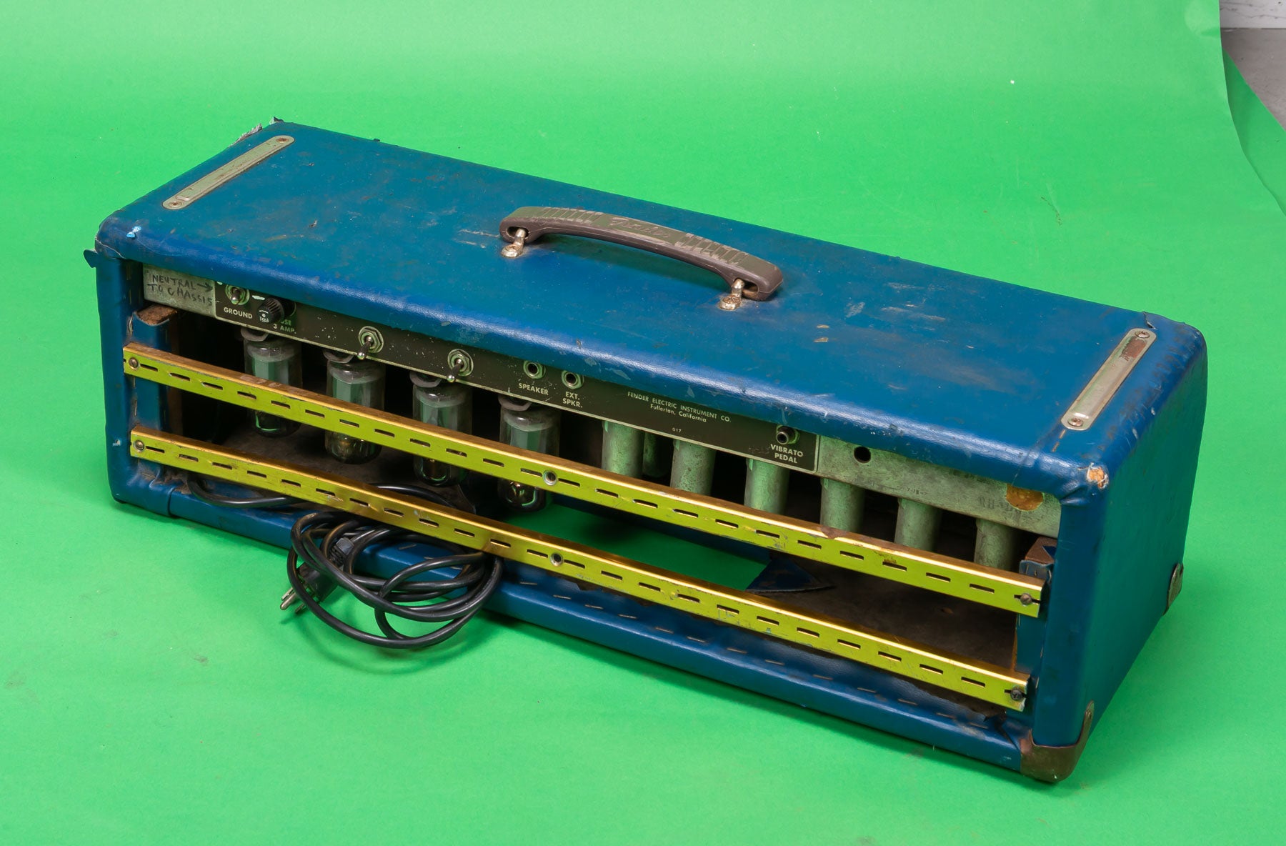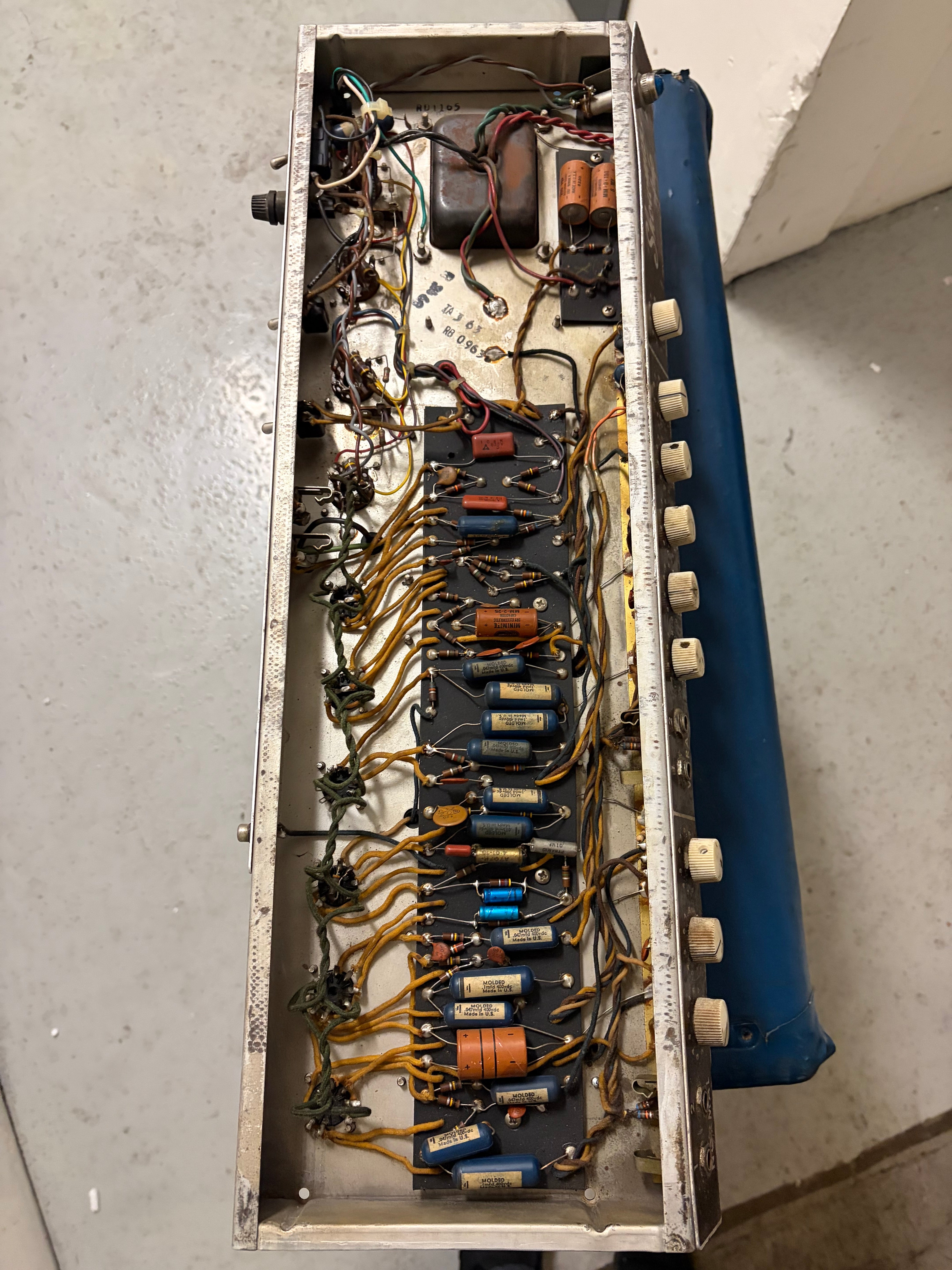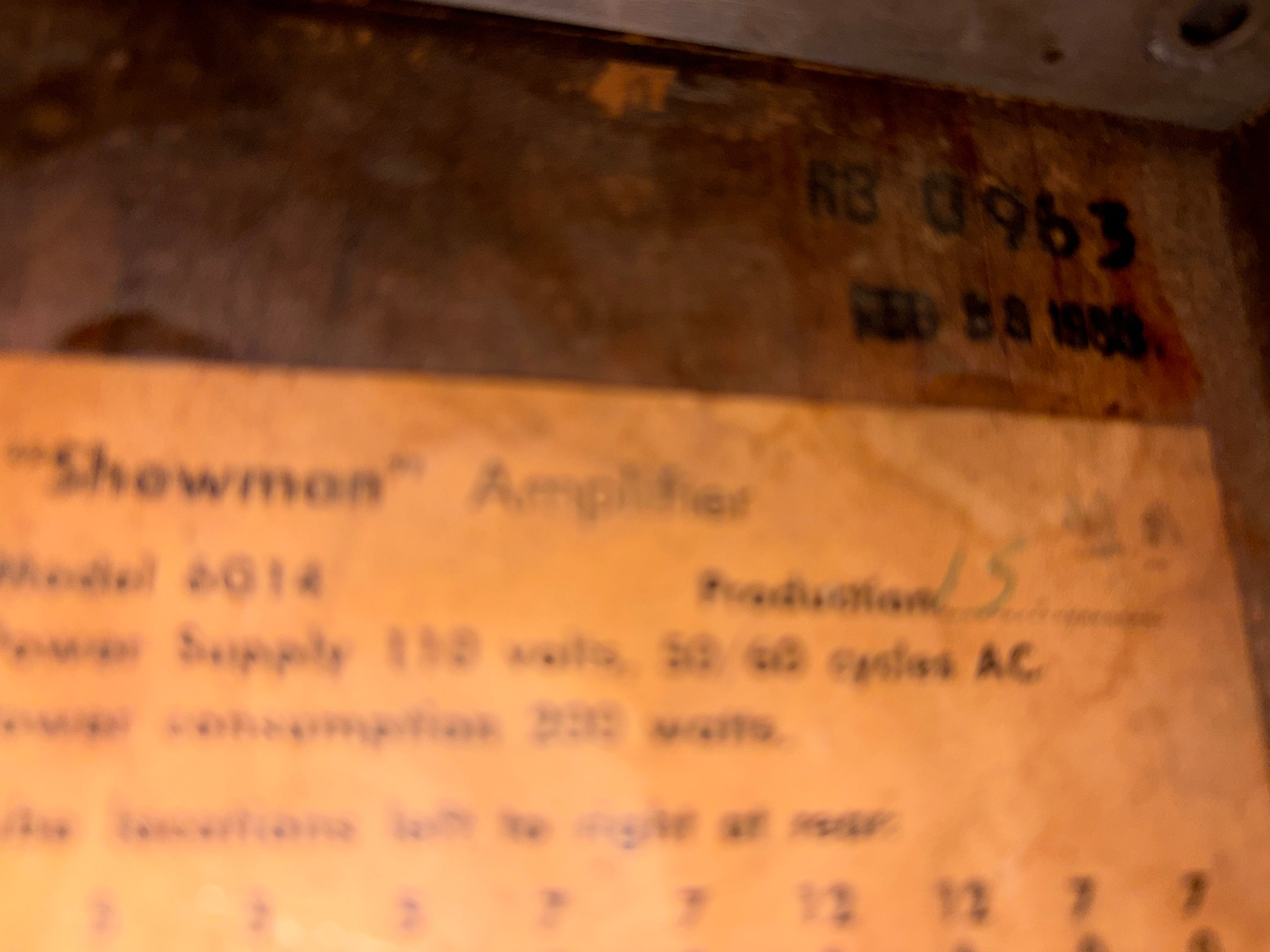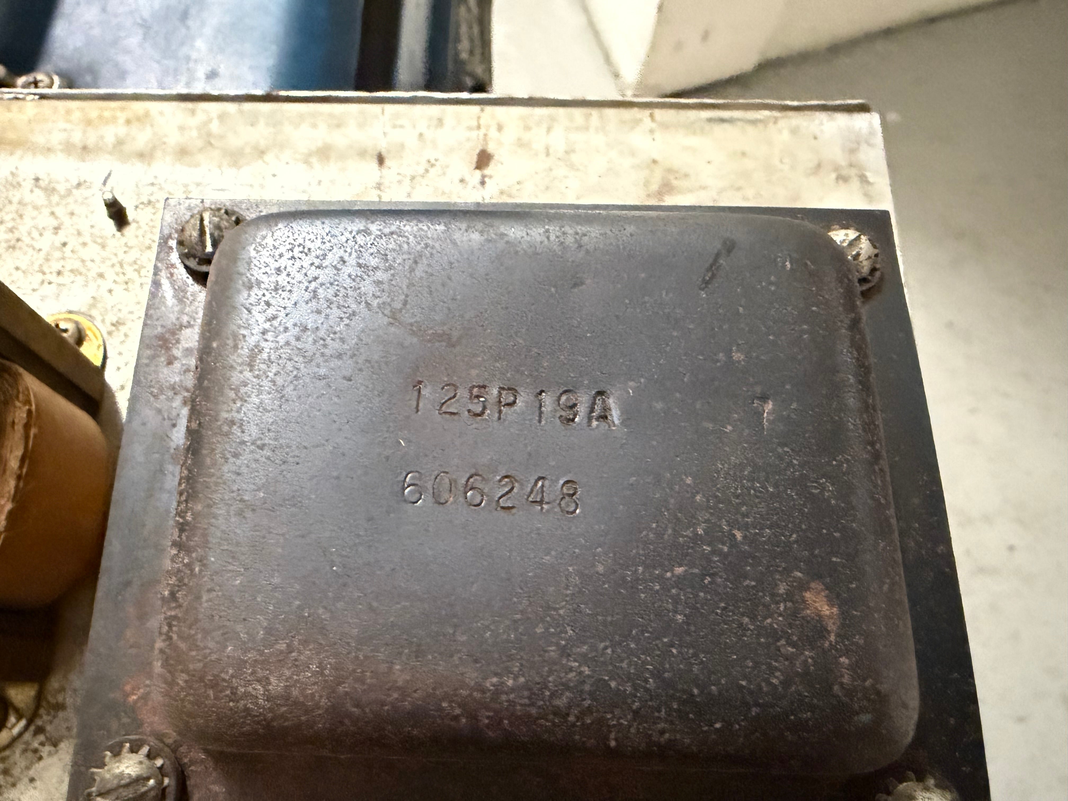 This one has been redecorated on the exterior but the insides are original. The original tolex and grill are missing, the handle is new. The amp has the original transformers and is working. There is a hole drilled in the back.