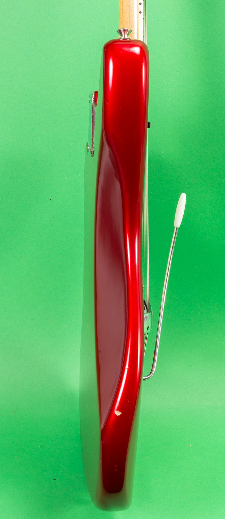 This one is either from late 1965 or early 1966, based on the features. It has the fingerboard binding but still has the pre cbs style Kluson tuners. This one is especially clean and original. The color still seems as new. There are some thin scratches on the back, I cannot see them in these pictures. I see some residue from a Fender body guard, on the side. The original case, arm and bridge cover are included with this very clean original custom color Jaguar.